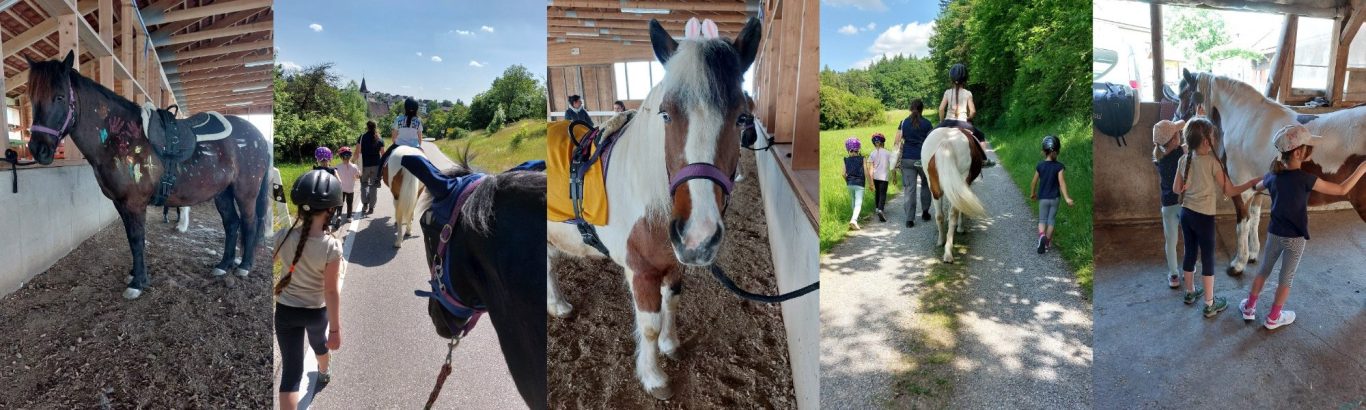 Wir erlernen wichtige Fähigkeiten im Umgang mit den Pferden. Neben dem Streicheln und Putzen, erfahren wir auch was zur Versorgung der Pferde dazugehört. Es gibt an das Alter und die Entwicklung angepasste Reiteinheiten und wir lernen Grundlagen zum Thema Pferd und Reiten in spielerischen Theorieeinheiten.